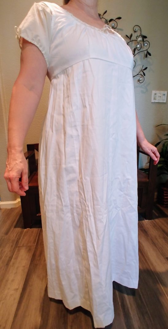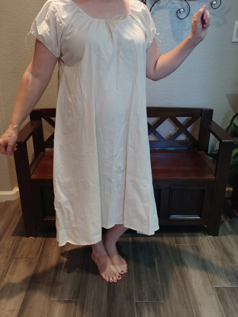 The first layer is the shift or chemise. Notice how plain and unadorned it is as well as being very shapeless. A chemise/shift provided a barrier between a woman’s body and the other layers of clothing, so the shift absorbed perspiration. I had my shift made out of poly cotton batiste which is as close to an heirloom fabric as I could find. A fine weave muslin would have worked well, too.