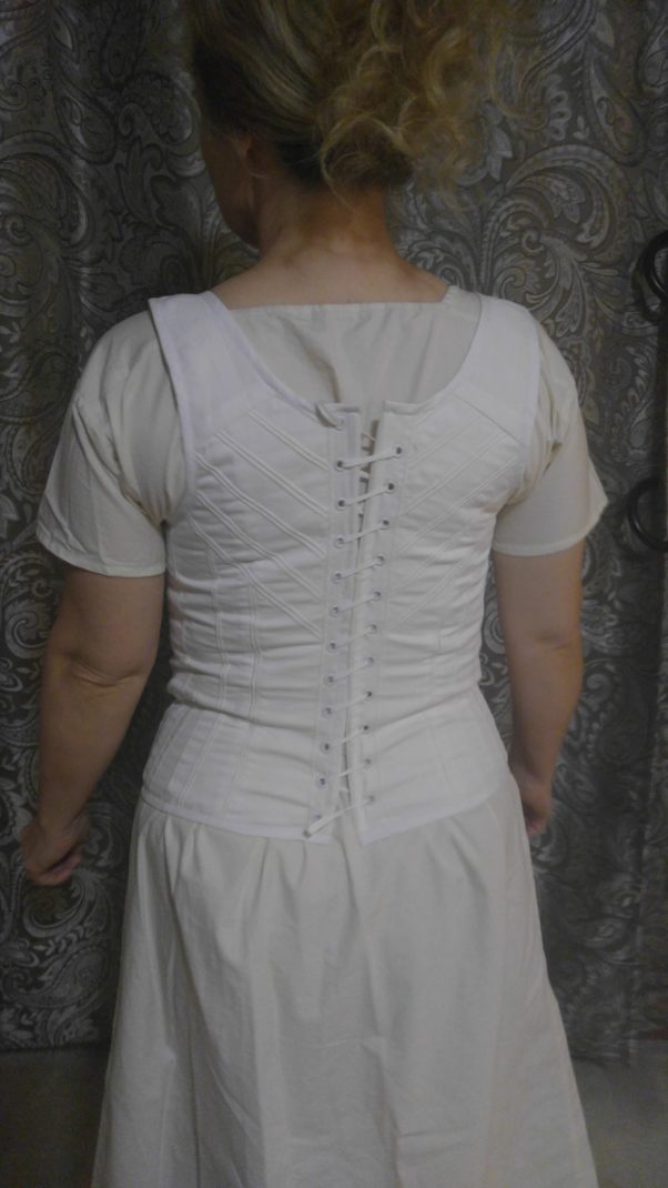 The next layer is the corset, which, during the Regency, was called Stays. This style of stays is called long stays. This is the kind of stays nearly every women, rich or poor, wore. The material we used these for stays was cotton twill. Later, I discovered that another good choice for stays or corsets is Coutil (or Coutille), a woven cloth created specifically for making corsets. These grommets are metal, but Regency stays have stitched button holes. Some women preferred short stays during the summer or if they were especially small busted, or if they didn’t have someone to help lace up their
